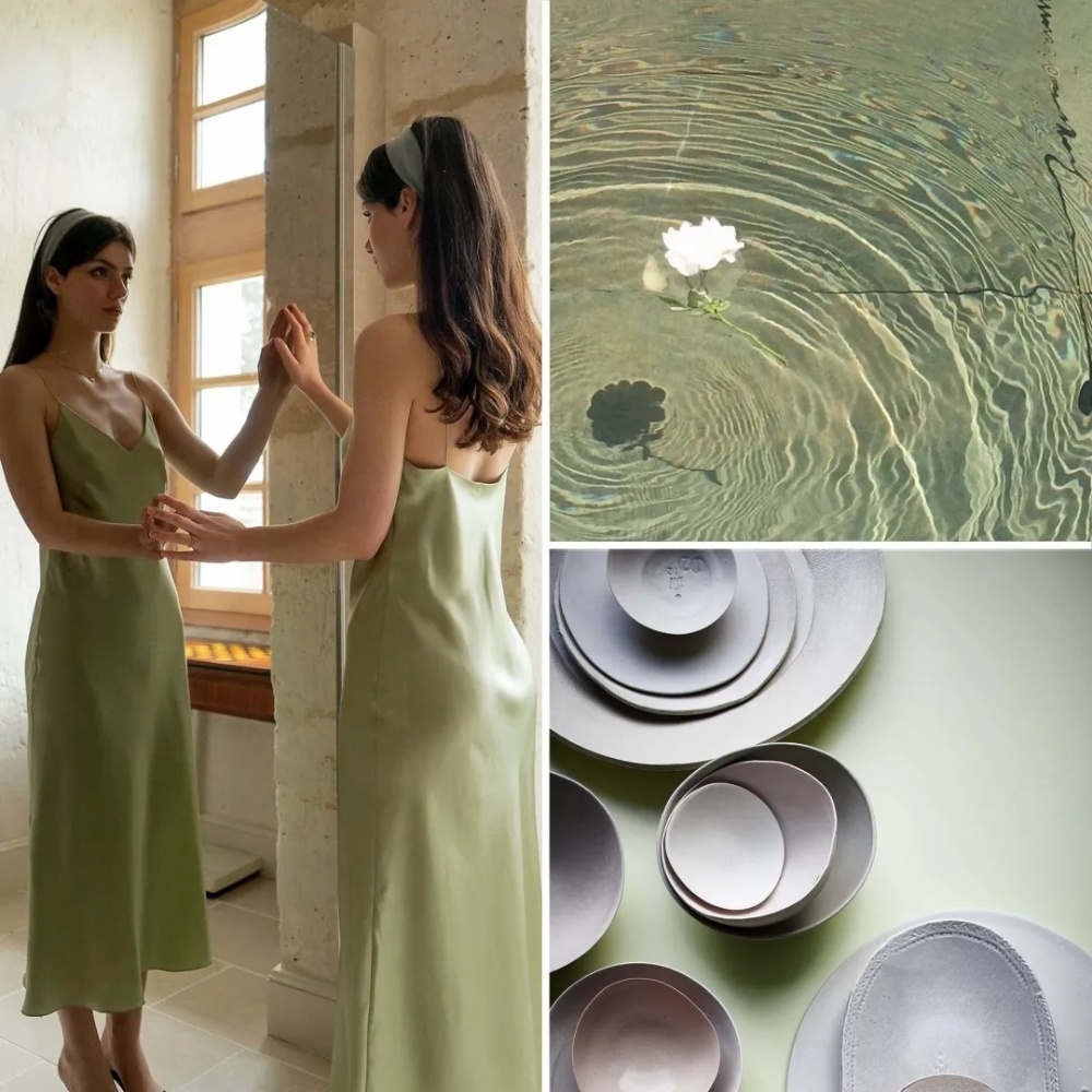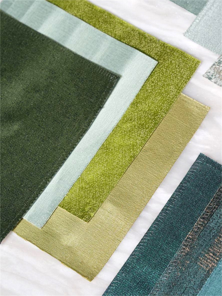 不同純度、明度的綠色,會給人不同的感覺。墨綠色穩重質樸、沉靜淡然;莫蘭迪綠恬靜淡雅;牛油果綠純凈自然,帶有文藝感……